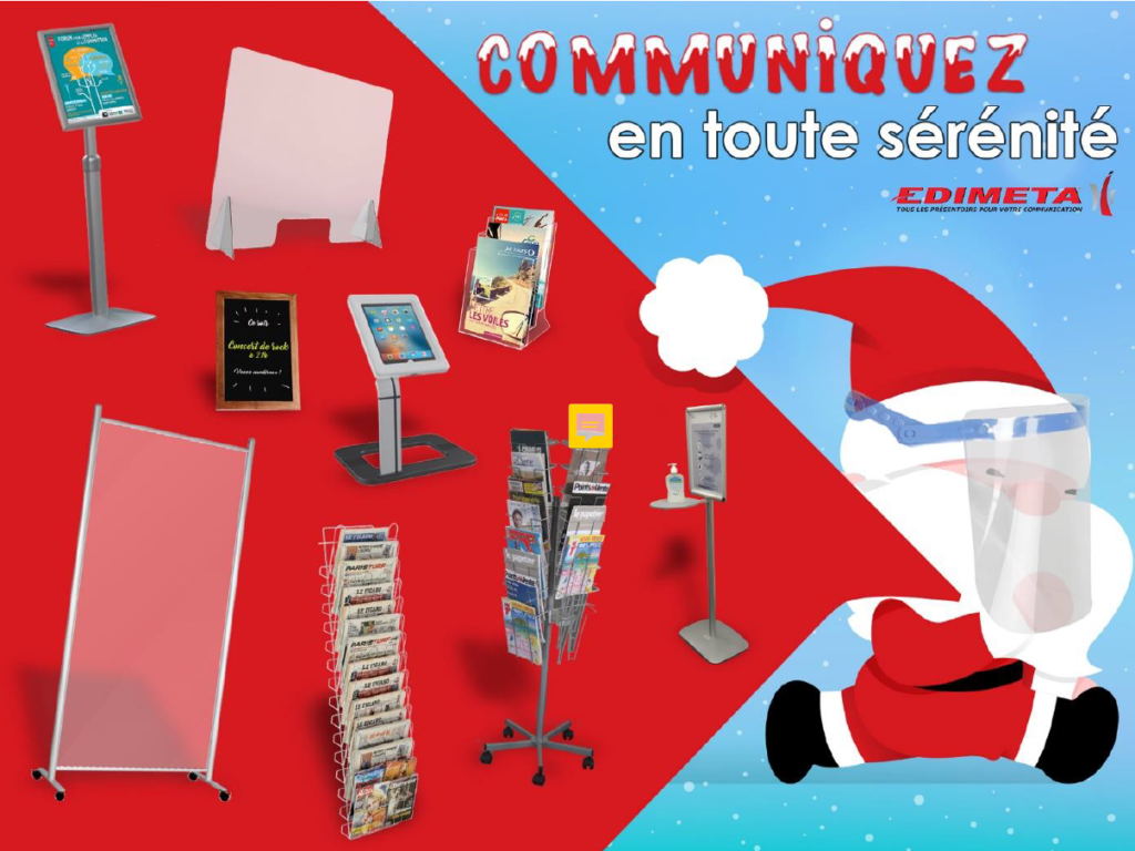 Profitez de la magie de fin d’année pour communiquer le plus possible auprès de vos clients, tout en assurant une sécurité maximale dans vos établissements. Pour cela, Edimeta vous accompagne avec de l’équipement de protection et d’affichage afin de passer des fêtes florissantes.
